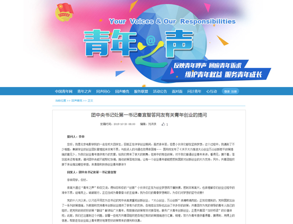 10月20日,團(tuán)中央書(shū)記處第一書(shū)記秦宜智通過(guò)“青年之聲”互動(dòng)社交平臺(tái)回答網(wǎng)友提問(wèn)。網(wǎng)頁(yè)截圖 中國(guó)青年網(wǎng)北京10月20日電(記者 劉妍彤) “我為你們的青春夢(mèng)想喝彩
